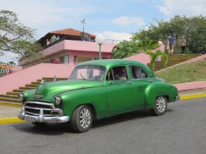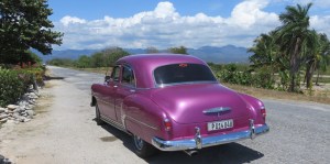 Autre rareté croisée à Trinidad, cette De Soto de 1950, encore utilisée quotidiennement comme taxi entre La Havane et la province, dans un état étonnant d’entretien plus que de restauration : tout à l’air d’origine. Il faut souhaiter qu’avec la levée prochaine de l’embargo, ces belles Américaines soient classées et restent dans le patrimoine cubain, pas tellement pour leurs propriétaires eux-mêmes que pour le plaisir des touristes ! Cette belle Chevrolet couleur framboise, rencontrée sur la presqu’île d’Ancon, ne peut pas se trouver ailleurs que dans un tel paysage de carte postale, avec ciel bleu tropical et palmiers…