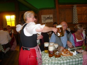 L’organisation est rigoureuse, malgré l’impression trompeuse d’une immense confusion : il faut que ces serveuses gèrent simultanément les commandes de bière, de “radler” (le panaché mi-bière, mi-limonade), de bière sans alcool et même de jus de pomme, tous les bocks ayant la même couleur pour un non–initié. Le ballet de la bière qui arrive est incessant, et l’orchestre rythme son concert d’un même refrain tous les quarts d’heure: “ein prosit, ein prosit, ein prosit der gemütlichkeit !”.