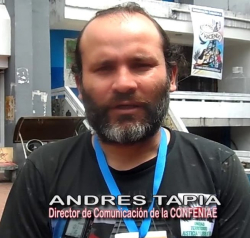 Intervenant pour la CONFENIAE, la confédération des nations indigènes de l’amazonie équatorienne, Andrés Tapia (à gauche) a également noté comment les travaux universitaires s’étaient enrichis de l’apport des jeunes, devenus grâce aux médias sociaux des acteurs de la communication dans le travail collectif de valorisation du patrimoine des communautés indigènes, à travers “une communication communautaire, alternative et populaire, un travail de lutte, de résistance et de mobilisation”.