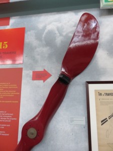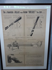 Première utilisation de la mitrailleuse, mais latéralement. Tout de suite on imagine que c’est plus facile pour le pilote de tirer dans l’axe de l’avion, premiers essais de tir à travers l’hélice, mise au point par Roland Garros d’un déflecteur métallique fixé sur l’hélice pour faire ricocher la balle plutôt que de briser l’hélice en bois (ci-dessus à gauche). Les Allemands copieront le dispositif sur un avion français abattu, puis c’est la mise au point de la mitrailleuse synchrone (à droite), avec un dispositif reliant le moteur au déclenchement de tir de l’arme de façon que les balles passent entre les retours de l’hélice… Pour suivre la séquence, il faut bien entendu passer de l’exposition temporaire, où sont exposés armes automatiques et canons embarqués, à la galerie permanente, où l’on retrouve l’hélice à déflecteur et les études de mitrailleuse synchrone.