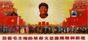 En 1968, les affiches de mao sont vendues dans la Sorbonne occupée par les étudiants en grève à Paris ; en Chine, Mao occupe la scène officielle, y compris artistique : “en avant victorieux dans la ligne révolutionnaire en art et littérature”. Autre poster intéressant de 1968 à la gloire de Jian Qing, l’épouse de Mao, qui profite de ce grand bouleversement pour se mettre en avant sur la scène politique et se faire le porte-parole de Mao, version gauchiste. C’est aussi le moment où le régime prend ses distances avec le grand frère soviétique, comme en témoigne un slogan de 1967 : “méfiez-vous du révisionnisme soviétique”. Une affiche de 1969 de Chen Jiang (ci-dessous) lance le slogan : “tous derrière Mao !” Une autre grande affiche de 1970 montre des étudiants massés sur un train, en train de partir éduquer les masses paysannes : “partez à la campagne, on a besoin de vous !”