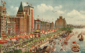 L’inspiration est encore, souvent, celle de la liesse populaire d’après la révolution, comme cette scène de fête à Shanghaï en 1963 avec le Bund illuminé et pavoisé, où le style du dessin reste traditionnel et rappelle les estampes chinoises plus anciennes.