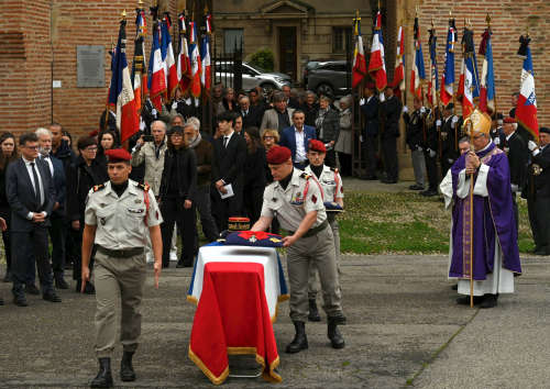 Aujourd’hui les parachutistes accompagnent à sa dernière demeure un frère d’armes qu’ils confient à leur patron, l’archange Saint Michel. Le 17° RGP se souvient de l’un de ses plus brillants chefs. L’Armée de Terre et plus généralement nos armées honorent un grand soldat. La France perd un de ses plus grands serviteurs. »