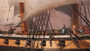 L’exposition présente en revanche un tableau symbolique de l’évasion de Napoléon quittant l’Elbe sur une petite flottille en déjouant la surveillance des Britanniques. On voit le brick le Zéphyr à gauche qui croise le brick L’Inconstant, peinture d’Ambroise-Louis Garneray. Le lendemain de son départ de Portoferraio, le 27 à 18 heures, au large du cap Corse, ayant évité plus tôt des bateaux anglais, le capitaine Taillade, second du commandant de L’Inconstant, reconnaît le commandant du Zéphyr, Andrieux, qui arbore le pavillon du gouvernement royaliste. “Nous allons à Livourne, et vous ?”, demande Andrieux. “Et nous, nous allons à Gênes” répond Taillade. “Comment va l’Empereur ?”, demande Andrieux. Napoléon, jusqu’alors caché derrière le pavois, prend le porte-voix et répond “à merveille !”. Le peintre le représente debout à l’arrière du navire, mais Andrieux ne l’a pas vu ou a fait semblant et continue sa route, tandis que l’Inconstant vire plein ouest vers Golfe Juan …