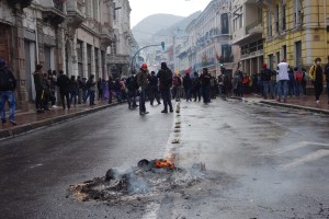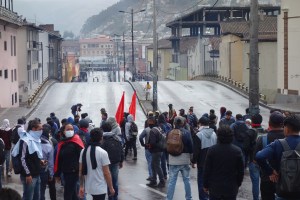 Aujourd’hui ce sont les manifestant qui convergent de partout et occupent un périmètre entre le bas de la vieille ville et la voie rapide. Un ballet très classique entre manifestants armés de pierre et policiers montés sur de petites motos qui vont et qui viennent, mais aucune d’impression d’organisation. Des vendeurs de trompes et de drapeaux équatoriens, comme à un match de foot. Des jeunes avec le visage masqué, certains même tout en noir… Surtout, une absence de slogans cohérents, avec essentiellement « Perros » (chiens) lancé aux policiers et « Fuera » (dégage) sans doute à l’attention du président.