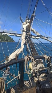 Puis ce sont les voiles qu’il faut hisser, avec des drisses toutes identiques comme les écoutes, et l’ordre à respecter en fonction des consignes du capitaine, relayées par les hurlements du bosco – en tchèque : sur le mât de misaine et le mat d’artimon, c’est toute une série de voiles qui se déferlent l’une après l’autre, grand-voile, hunier, perroquet, cacatois et, selon le vent, foc, clinfoc, voile d’étai et brigantine. L’exercice se fait perchés dans les haubans et le long de chaque bôme, il faut ne pas avoir le vertige quand le bateau tangue ou roule.