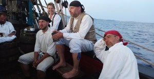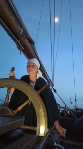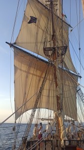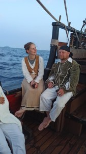 Parfois, les stagiaires sont des passionnés d’Histoire comme ce groupe venu de Brno avec qui j’ai partagé un embarquement, dont les participants s’étaient confectionnés des costumes d’époque : habitués des reconstitutions de batailles historiques dont les batailles napoléoniennes, ils avaient préparé de superbes costumes d’une très grande qualité, donnant à La Grace un rayonnement tout particulier. Et si d’aventure un plaisancier voit surgir ce menaçant brick noir et jaune, sabords ouverts et canons pointés, qu’il reste calme et arme à son tour ses objectifs : c’est un spectacle à ne pas rater…
