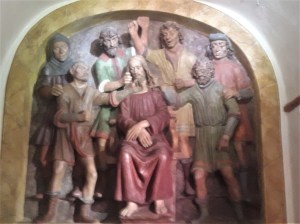 Dans la chapelle représentant la maison d’Anne le grand prêtre, une frise de sculptures s’appuie sur des fresques qui la prolongent et lui donnent de la profondeur de champ. Anne est sur la droite (ci-dessous à droite), et regarde le Christ giflé par des soldats. Les personnages de cette série sont parmi les plus expressifs de cette « Jérusalem », par leur réalisme et par leur mouvement, accentué par le fait d’avoir assis le grand prêtre sur un siège vu de trois quarts.