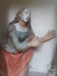 Juste avant la chapelle du saint-Sépulcre, avec un Christ grandeur nature allongé dans son tombeau (ci-dessous à gauche), la petite chapelle du Calvaire (à droite), avec le “Stabat Mater”qui permet de voir la crucifixion depuis le bas, et un autre accès par le haut…