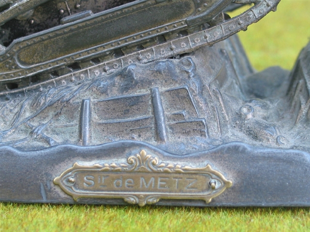 Le char fait 8 cm de long, l’objet en tout fait 13,5 cm, et il est en régule, un alliage d’étain ou de plomb et d’antimoine qu’on utilisait en période de guerre ou d’immédiat après-guerre, quand le cuivre manquait, réservé aux munitions. Un alliage clair au départ, qui s’oxyde ou se patine et devient plus foncé, pas très facile à nettoyer.