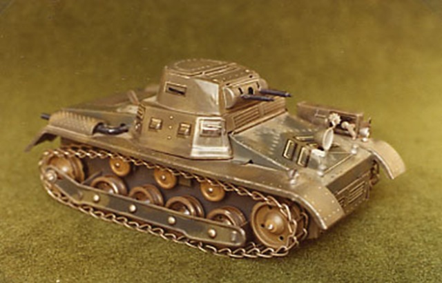 Après des modèles plus ou moins fantaisistes, le PanzerKampfWagen (PzKw) 1 va, de sa production en 1934 jusqu’aux années de la guerre, dominer la scène du jouet. Facilement reconnaissable à sa tourelle à deux mitrailleuses, il sera adapté ensuite, en tant que jouet, par une simple modification de la tourelle et un accroissement de ses proportions, pour ressembler aux modèles successifs de la Wehrmacht, les PzKw 2 et PzKw 3, puis 4. La guerre mécanisée devient une réalité qui s’impose aux jeux des enfants, comme un véritable conditionnement, avec les bataillons de soldats en résine, la gamme complète des blindés et véhicules d’accompagnement : automitrailleuses, tracteurs d’artillerie, camions, etc.
