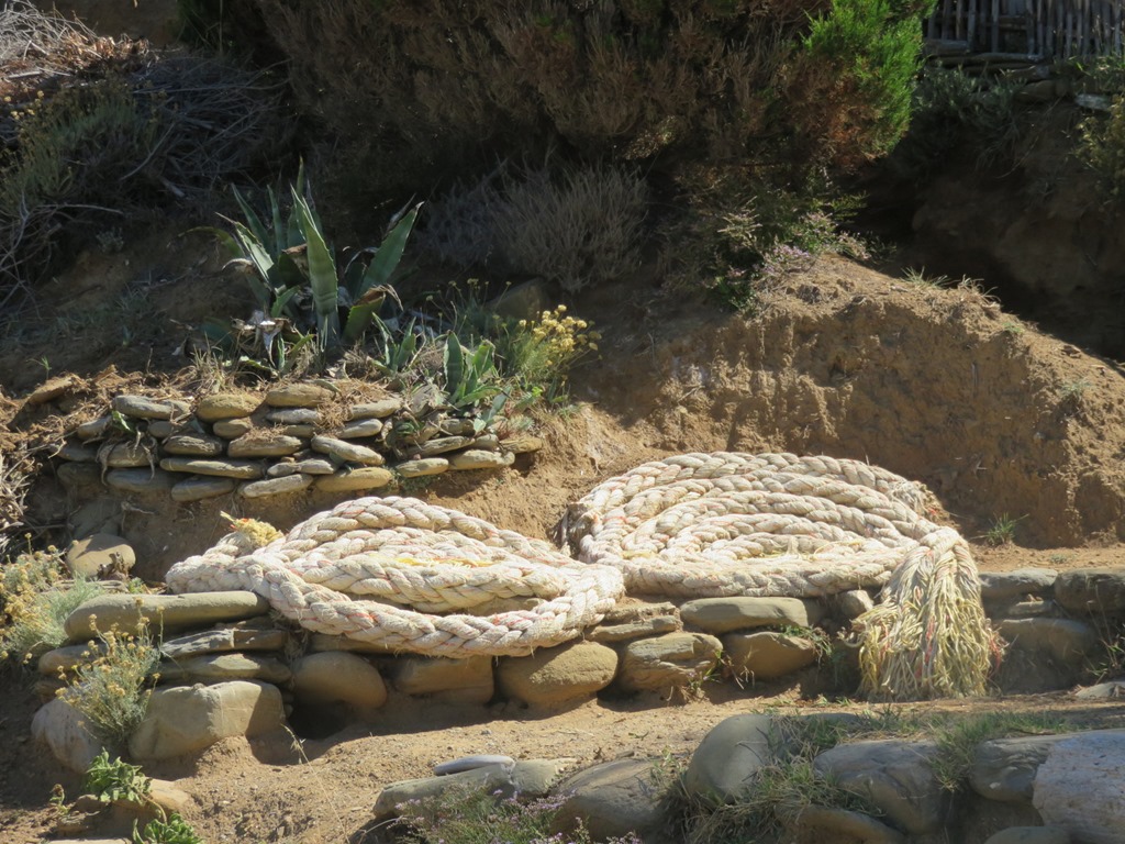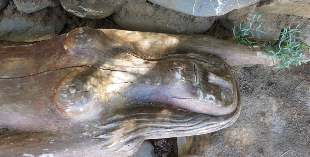 A 75 ans passés, il y habite seul depuis une quinzaine d’années, de mai à octobre, et a embelli le site complètement sauvage par ses sculptures en bois : sirènes, totems, dauphins, créatures marines. L’année dernière, des pluies torrentielles déferlant depuis les collines ont emporté la plupart de ses sculptures, balayant la plage et la parsemant de blocs de pierres et de débris de bois.