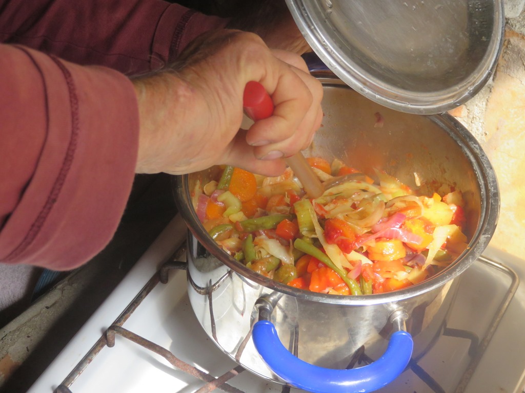 Et pour montrer qu’il est accueillant, il propose au promeneur de partager son repas, une ratatouille qui mijote sur le feu. Une table est dressée sous une toile faisant office de parasol, ses provisions sont gardées dans un cellier fermé par une porte solide mais sans une bouteille de vin : il ne boit pas.