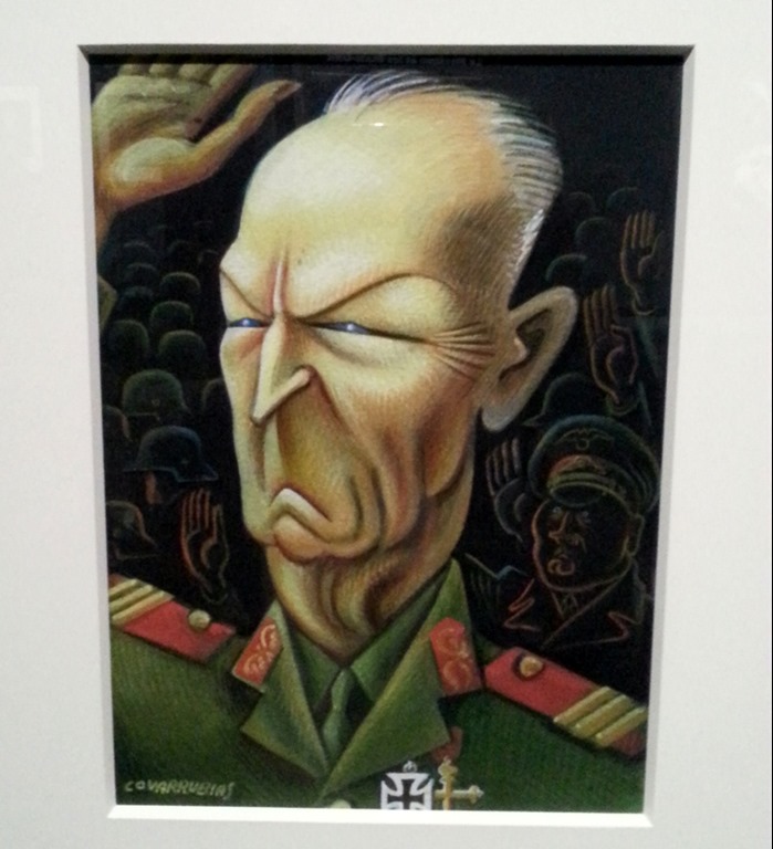 L’exposition est riche d’une incroyable diversité d’œuvres, avec d’autres artistes majeurs comme Gabriel Fernandez Ledesma, ici à gauche avec “La passerelle” (sans date), il était lui aussi peintre muraliste, sculpteur, photographe et graveur, membre de la Ligue des écrivains et artistes révolutionnaires. A droite, “Ion Antonescu” de Miguel Covarrubias (1940), dans une série de petites caricatures féroces de Hitler, Staline, Franco et des dirigeants de ces années de guerre à savourer en détail.