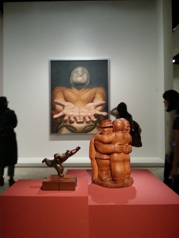 Au milieu des peintures, beaucoup de sculptures rappellent évidemment l’art aztèque et maya dans les formes, de même que le thème de la mort toujours étroitement lié à celui de la vie, avec l’actualité de la révolution mexicaine, de ses combats et de ses exécutions sommaires qui n’épargnent jamais les civils. A gauche “L’Etreinte” (les trois camarades) d’Ezequiel Negrete Lira (sans date), en premier plan devant l’impressionnant “Notre image actuelle” de David Alfaro Siqueiros (1947). A droite, une “Tête” de Juan Cruz Reyes (vers 1950).