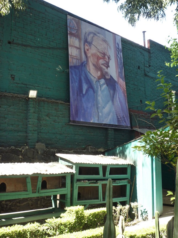 La vie de Trotsky ressemble désormais à celle d’un reclus, totalement retranché dans sa citadelle, faisant vérifier et fouiller ses visiteurs. La vie se déroule dans la pénombre des fenêtres semi-murées, renforçant l’austérité du décor, et derrière de grosses portes blindées, sans que le travail se ralentisse pour autant : Trotsky reçoit des militants du monde entier, anime la IVe Internationale, publie articles et livres sans désemparer – il sera arrêté en plein élan alors qu’il rédigeait une biographie de Staline. Mais c’est aussi une austérité choisie, car Trotsky se voulait un « homme nouveau », loin de tout confort, proche des travailleurs et des paysans. Et pour illustrer son idée, il avait fait construire des poulaillers, qui servaient à la subsistance du petit groupe des proches et des gardiens, et s’occupait lui-même de nourrir « ses » poules. (Ci-dessous à gauche, les poulaillers, à doite, une porte blindée sur le jardin).