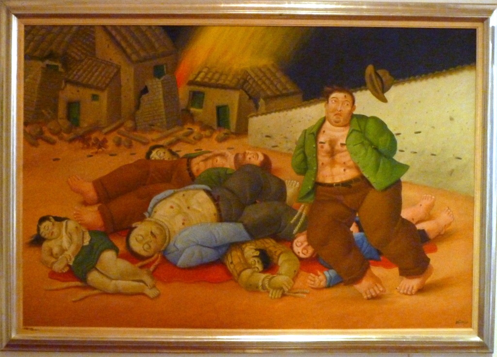 Les organisateurs préviennent le visiteur que, même si le lien est évident et direct entre les scènes de violence présentées et les évènements survenus en Colombie ces dernières décennies, Botero dénonce plus généralement la violence qui s’est intensifiée dans la région à partir des années quatre-vingt, avec l’explosion du trafic de stupéfiants et la violence qui entoure cette progression, la montée du nombre des victimes étant illustrée ici par des massacres collectifs et des forêts de cercueil…
