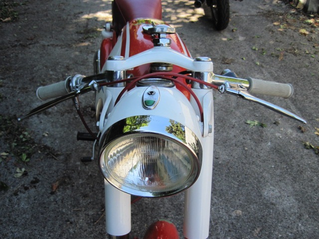 Cette moto a certainement été une « roule-toujours » dans son jeune âge, les années 1960. Elle a peut-être même fait des courses de côte ou du circuit, comme on en fait si couramment dans le nord de l’Italie. Aujourd’hui, j’hésite à dépasser le 90 km/h, pas seulement à cause des limitations de vitesse et du fait que son compteur est devenu totalement fantaisiste, mais aussi parce la notion de vitesse est une chose relative et que, sur sa selle très étroite et avec ses freins à tambour très symboliques, on hésite à la pousser davantage. Mais quel plaisir !
