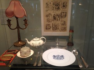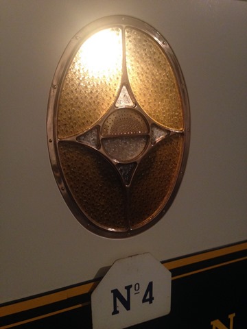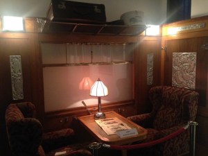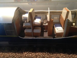Cette fois pas de locomotive ni de wagon grandeur nature, mais des fragments de voiture, des intérieurs avec leurs panneaux décoratifs originaux, des compartiments reconstitués : wagon-restaurant, salon, cabine, complétés par les objets et accessoires de la compagnie