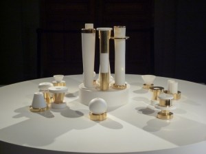 Le résultat est étonnant, car très inhabituel. On cherche l’utilité des objets en blanc et or qui forment un très beau milieu de table (ci-dessous à droite), puis on se souvient que le choix délibéré est que ce ne soient pas des objets utilitaires mais bien des éléments décoratifs…