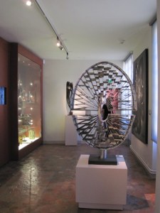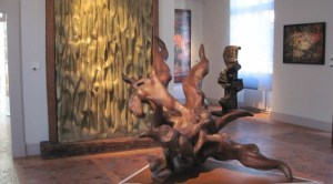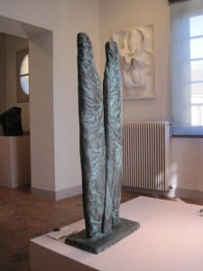 Une première exposition est consacrée à une série de tableaux, sculptures et tapisseries d’art contemporain, il faut se laisser mener par l’inspiration, les œuvres attirent de loin, taches de couleur éclairées dans l’enfilade des couleurs ou, au contraire, sculptures cachées au détour d’un mur et surprenant le regard qui les découvre.