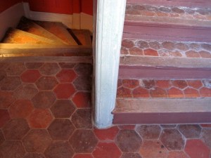 Deux très jolis escaliers en bois, de chaque côté de la maison, ont encore des tomettes d’époque lointaine – je ne saurais dire laquelle, mais du genre qu’on ne trouve pas chez Castorama. Au premier étage, une enfilade de pièces pas très spacieuses a été valorisée par la restauration des poutres et la peinture des murs en couleurs douces, mettant bien en relief les œuvres exposées, avec un éclairage et des explications également valorisants et conservant une ambiance intime.
